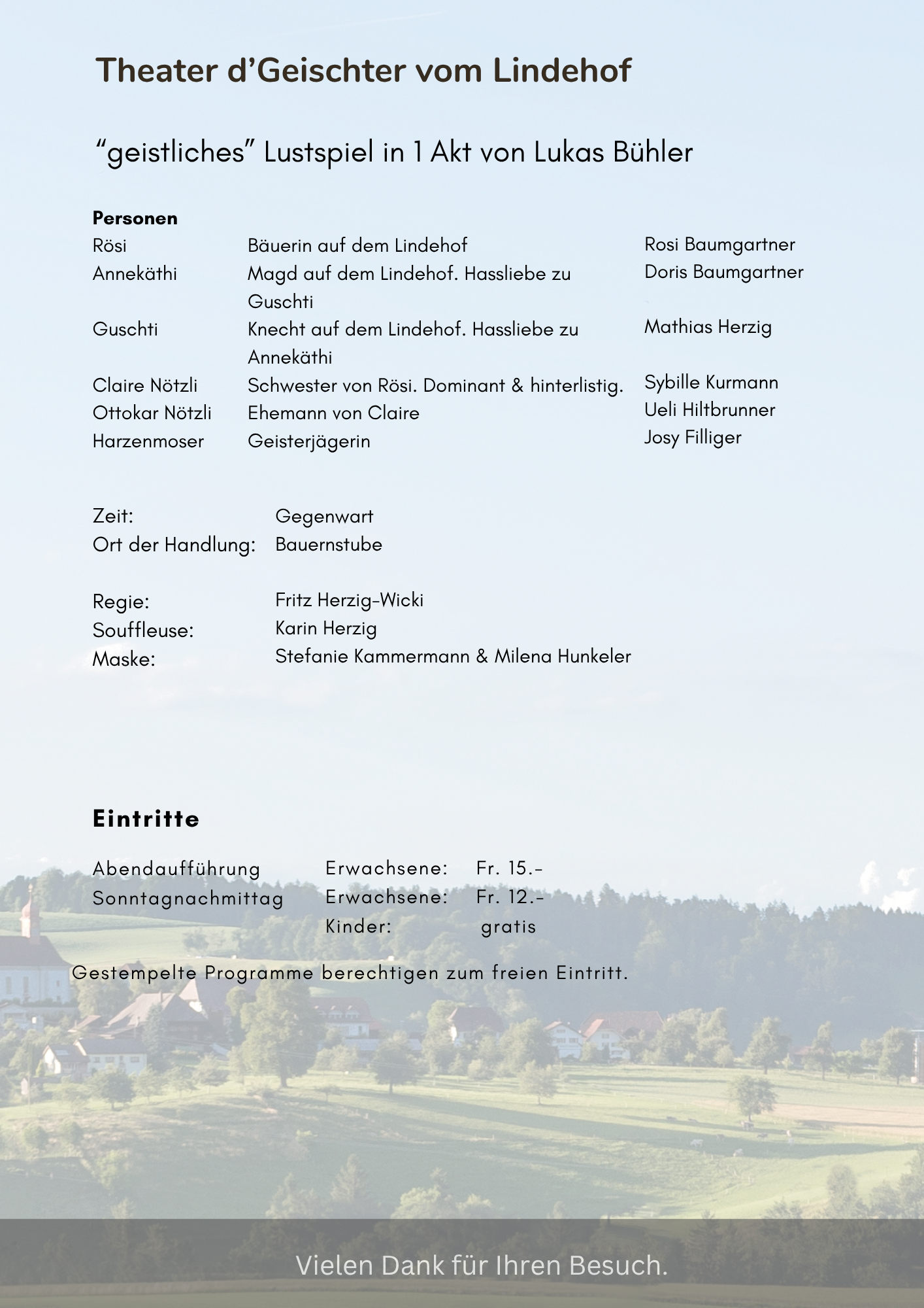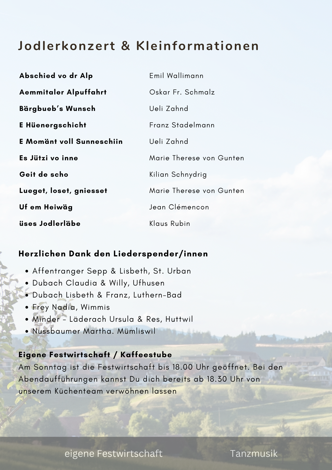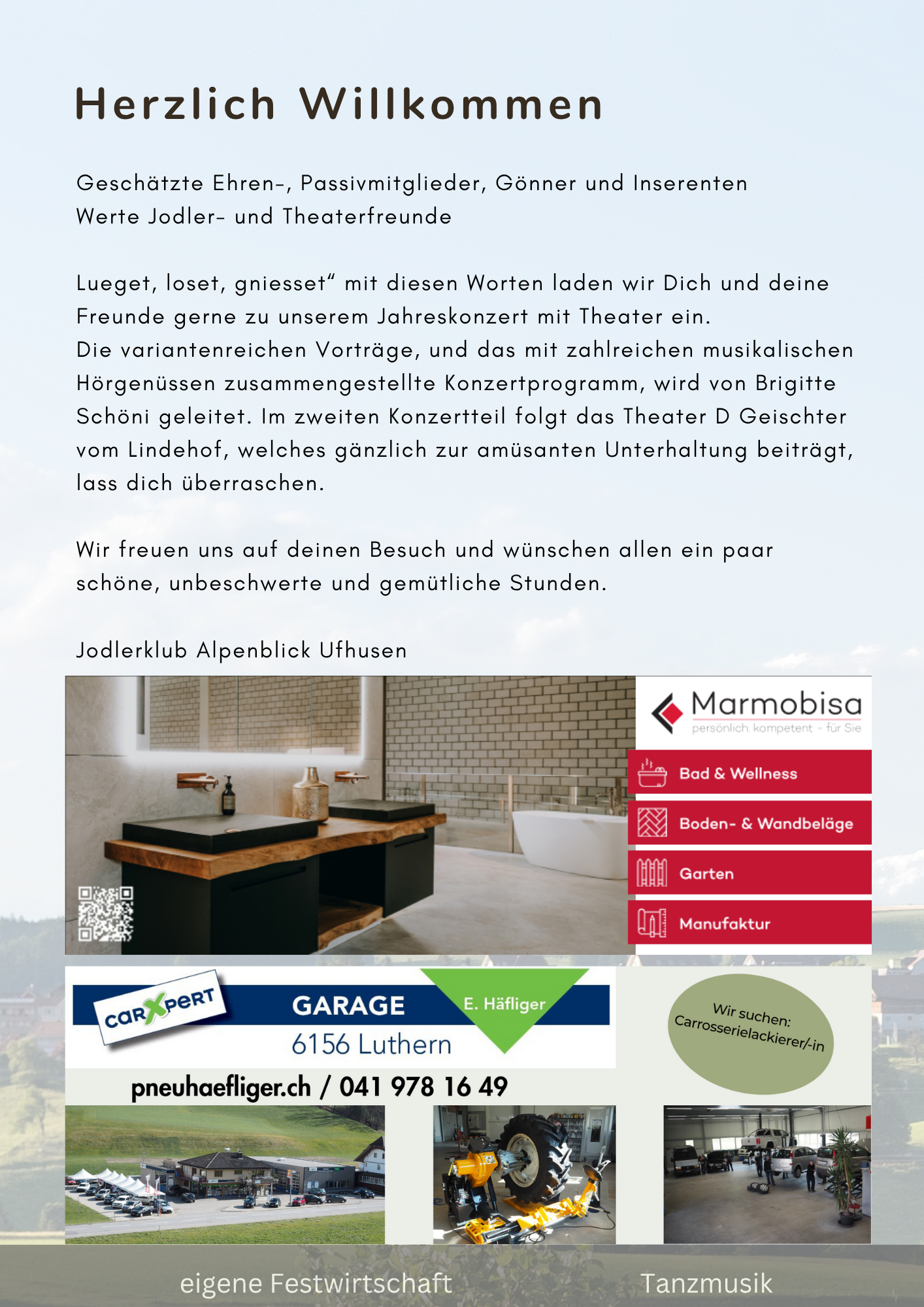 «Lueget, loset. gniesset» mit diesen Worten, welche zugleich den Titel des Festlieds 2025 sind, laden wir Dich und deine Freunde gerne zu unserem Konzert und Theater ein. Die variantenreichen Vorträge, und das mit zahlreichen musikalischen Hörgenüssen zusammengestellte Konzertprogramm, wird von Brigitte Schöni geleitet. Es haben sich wiederum diverse Kleinformationen aus dem Jodlerklub Alpenblick formiert, wie genau bleibt eine Überraschung. Im zweiten Konzertteil folgt das Theater «d’Geischter vom Lindehof», welches gänzlich zur amüsanten Unterhaltung beiträgt, lass dich überraschen. Die Theatergruppe ist unter der bewährten und erfahrenen Leitung von Fritz Herzig-Wicki. Am Samstagabend spielt das Schwyzerörgeli-Quartett Sonneschyn aus Zell zum Tanz auf.
